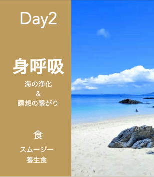 2日目は、朝からビーチで瞑想とヨガを行い、地球上の生命を生み出してくれた雄大な海のエネルギーで体を浄化します。