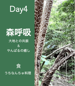 森林で行う呼吸によって地球のエネルギーを最大限に吸収し、深い癒しを受けます。食事は地元のうちなんちゅ料理を楽しみます。